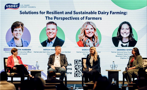 In the photo, USDEC President and CEO Krysta Harden is shown moderating a panel discussion, “Solutions for Resilient and Sustainable Dairy Farming.” Dairy farmers Mitch Hancock (Utah), Siska Reece (Idaho), and Joanna Shipp (Virginia) shared perspectives on what sustainability means for their families, their farms, and their future—and how they are working every day to provide responsibly produced dairy nutrition to the world.